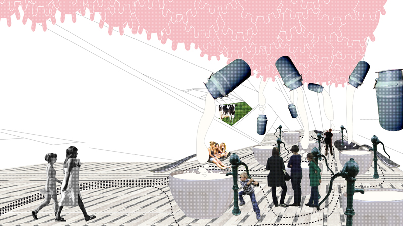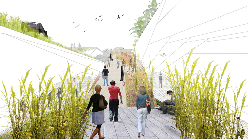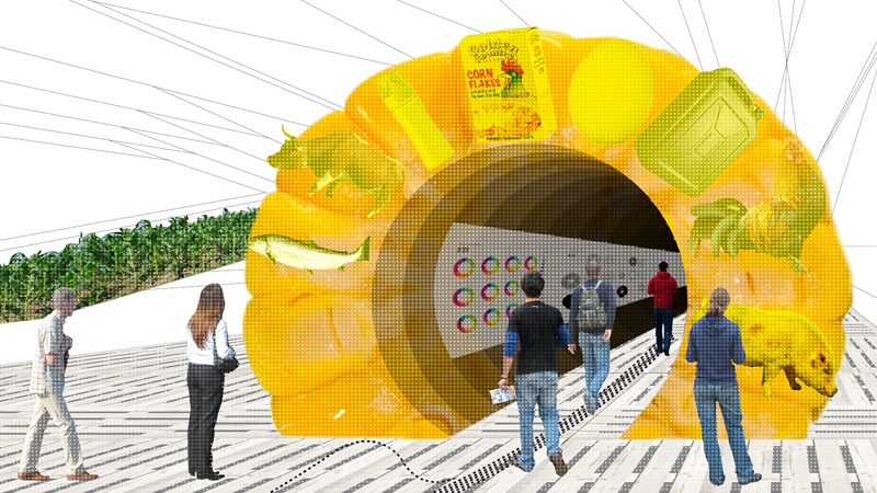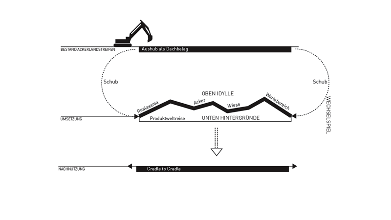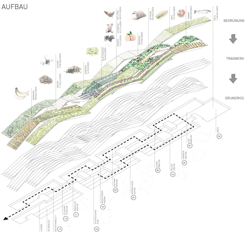 "Als würden Streifen aus dem Ackerland geschnitten – so wirkt das gefaltete und begrünte Dach des Entwurfs. Es wird ebenso genutzt wie der Innenraum, denn die Besucherschlange soll über das Dach zum Eingang geführt werden, vorbei an Maisfeldern und Blumenwiesen. Im Inneren dann zeigt eine Ausstellung, was in Deutschland auf den Teller kommt – und was der Konsument damit gegebenenfalls weltweit anrichtet. Wie werden Bananen angebaut? Wie leben die Tiere, die wir verzehren? Unter welchen Bedingungen arbeitet der Kaffeebauer, der unseren Frühstückskaffee anpflanzt?