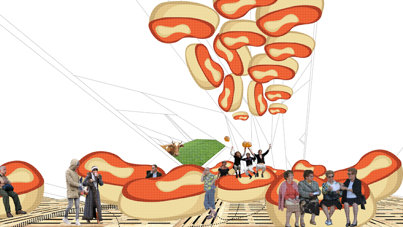 Dabei heben die beiden Absolventen nicht den moralischen Zeigefinger: Knautschige Sofas in Rindersteakoptik, tanzende Kaffeekannen – die Moral kommt mit einem Augenzwinkern und angereichert um jede Menge Information daher. Und das Beste: Nach der Expo kann der ganze Pavillon komplett vergraben werden. Alles kompostierbar. Nachhaltiger geht es kaum."